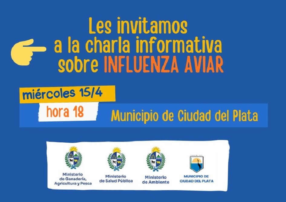 El Municipio de Ciudad del Plata convoca a la población en general a participar de una charla informativa abierta sobre influenza aviar, que se realizará el miércoles 15 de abril a las 18:00 horas en el espacio cultural del Municipio de Ciudad del Plata. La actividad está dirigida a productores, pescadores artesanales y público en general, y contará con la participación de representantes del Ministerio de Salud Pública y del Ministerio de Ambiente, en una propuesta abierta y gratuita.