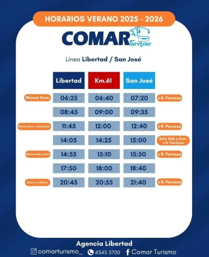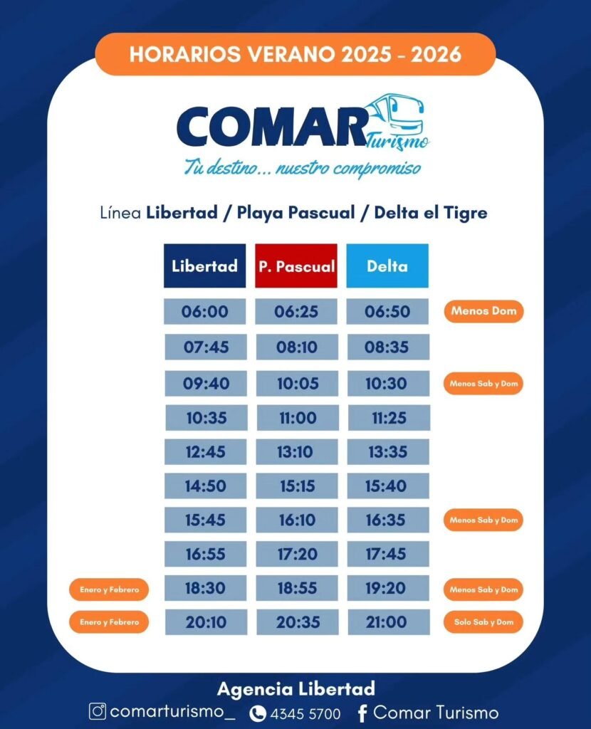La empresa COMAR conecta Libertad, Delta El Tigre, Playa Pascual, Kiyú y San José de Mayo. Consulta HORARIOS DE COMAR completos en nuestra web.