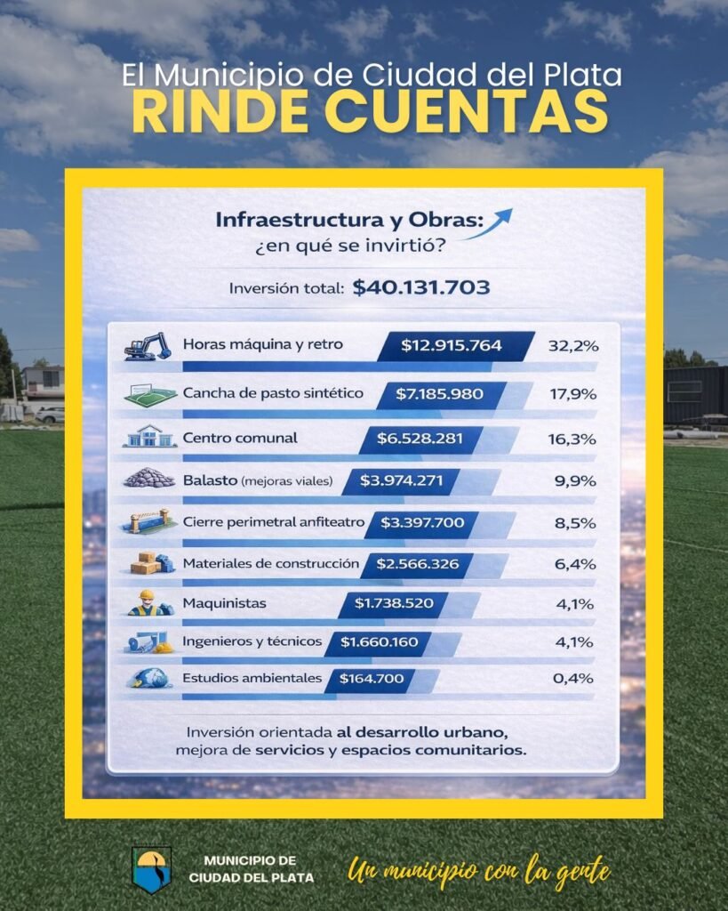 El Municipio de Ciudad del Plata dio a conocer detalles de la inversión que realizó en los primeros seis meses de gestión del 2025, e informó a través de sus cuentas digitales oficiales que; destinó la mayor parte de sus recursos a obras e infraestructura, priorizando invertir donde realmente impacta en la vida de la gente en Ciudad del Plata.