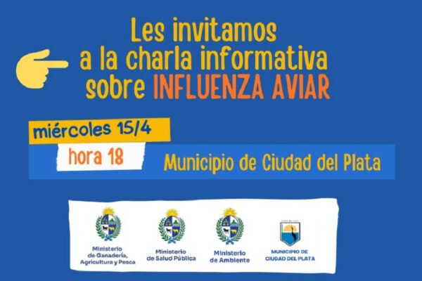 Convocatoria abierta a la comunidad – Charla abierta sobre influenza aviar El Municipio de Ciudad del Plata convoca a la población en general a participar de una charla informativa abierta sobre influenza aviar, que se realizará el miércoles 15 de abril a las 18:00 horas en el espacio cultural del Municipio de Ciudad del Plata….